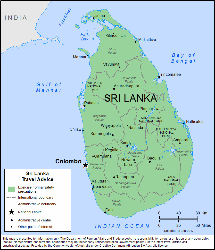 Tento ostrov se nachází v blízkosti Indie, od které je oddělen Palkovou úžinou. K významným městům zde patří ku příkladu Dehivala, Moratuva, Kandy, Jápané a trinkunámalé.